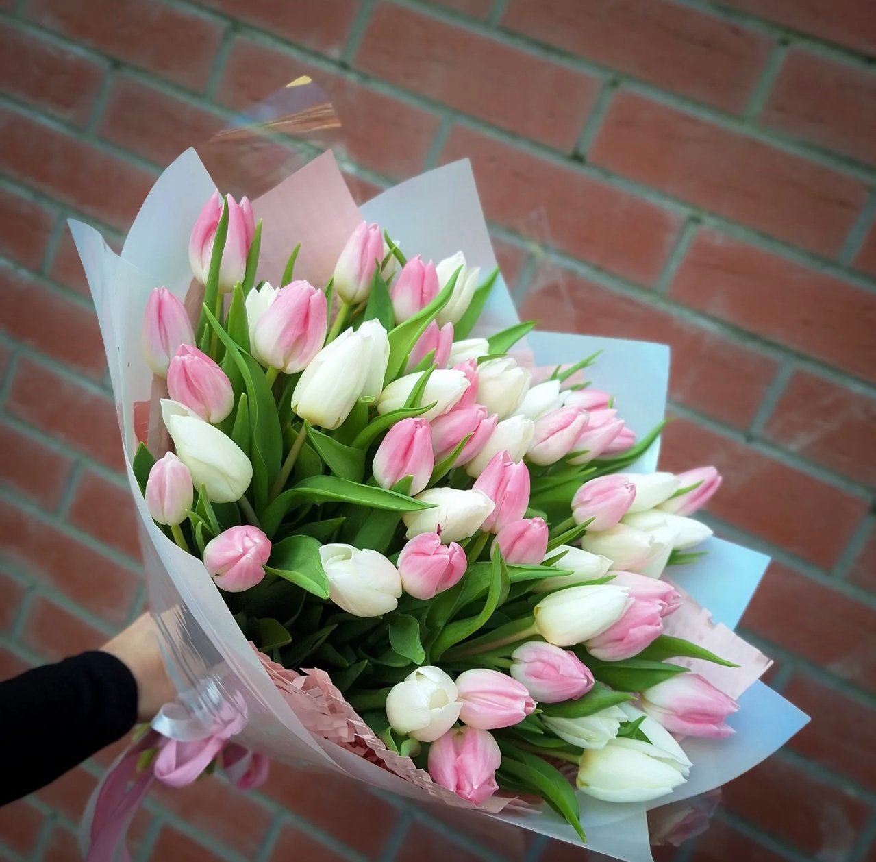 Baltų ir švelniai rožinių tulpių puokštė