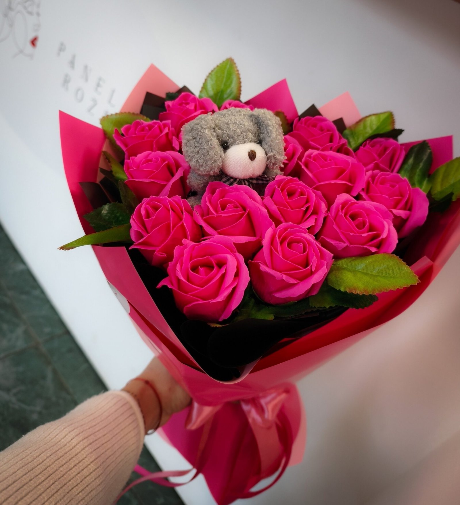 Ryškios rožinės spalvos muilo rožių širdelė su mielu meškiuku. Muilo rožes galima sunaudoti.