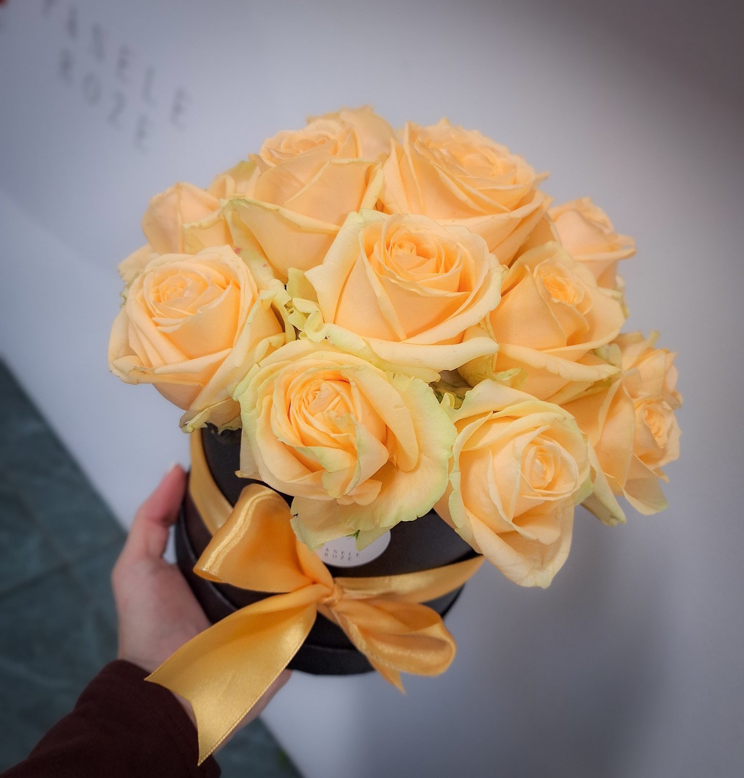 Gėlių dėžutė su persikinėmis rožėmis spinduliuoja švelnumą, eleganciją ir subtilią prabangą.