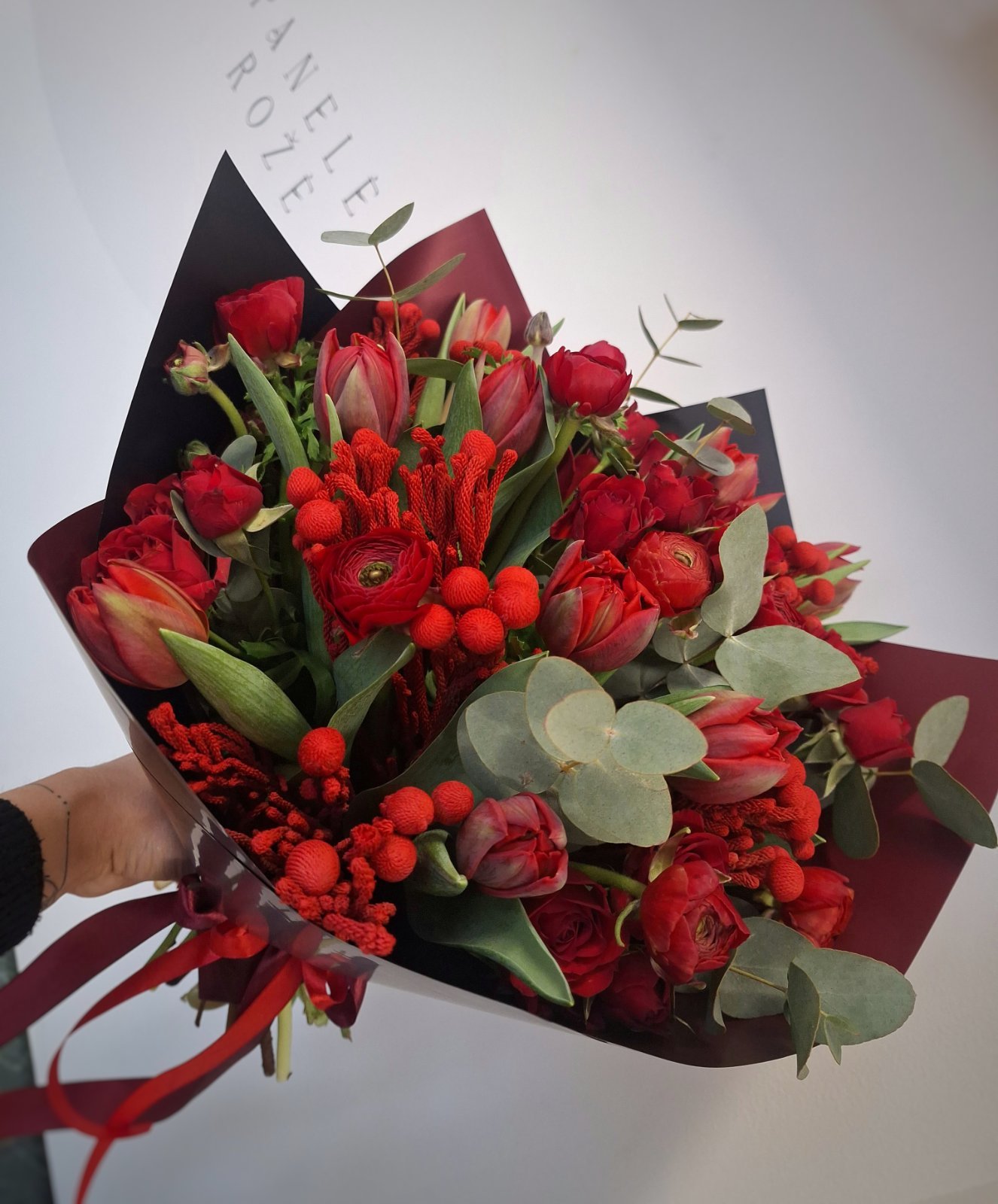 Ši puokštė – tai brandžios elegancijos ir gilios aistros derinys. Joje dominuoja sodrūs raudoni atspalviai, kurie simbolizuoja stiprius jausmus, pasitikėjimą ir išskirtinumą. Tulpės, ranunkuliai ir smulkūs tekstūriniai akcentai suteikia kompozicijai gyvumo bei natūralios prabangos pojūtį. Eukalipto žaluma subtiliai subalansuoja ryškią spalvų paletę, suteikdama lengvumo ir modernumo.