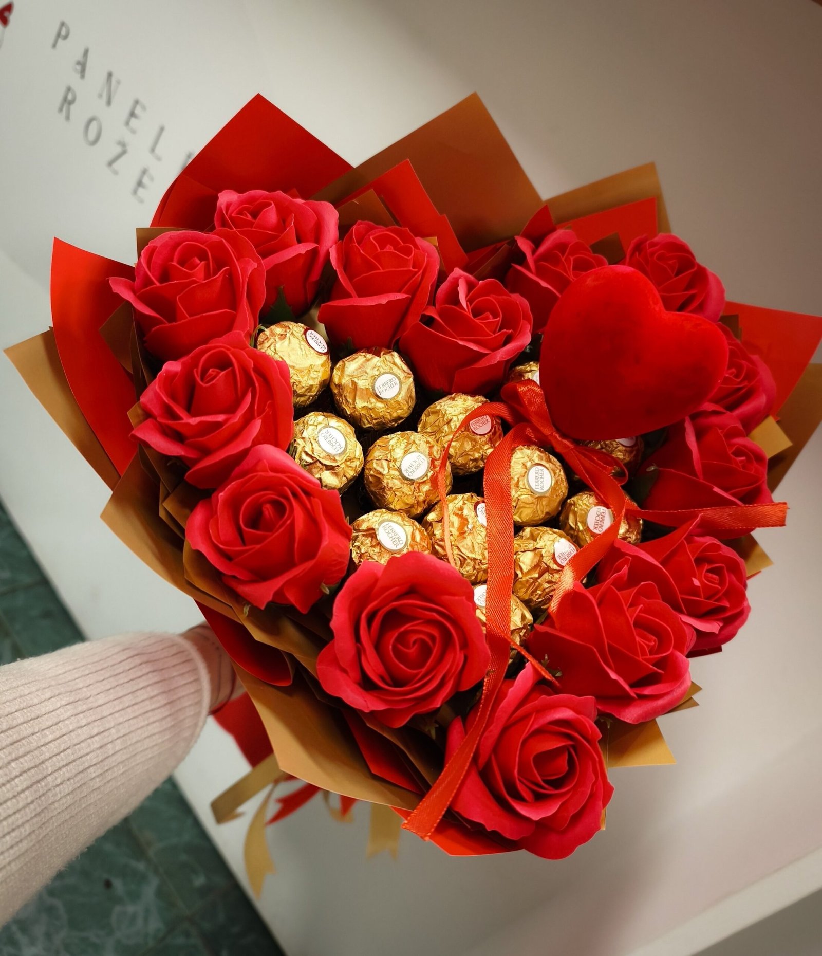 Nuostabi ir kvapni muilo rožių ir Ferrero Roscher saldainių kompozicija širdies formos, dekoruota širdele. Rožytes galima sunaudoti.