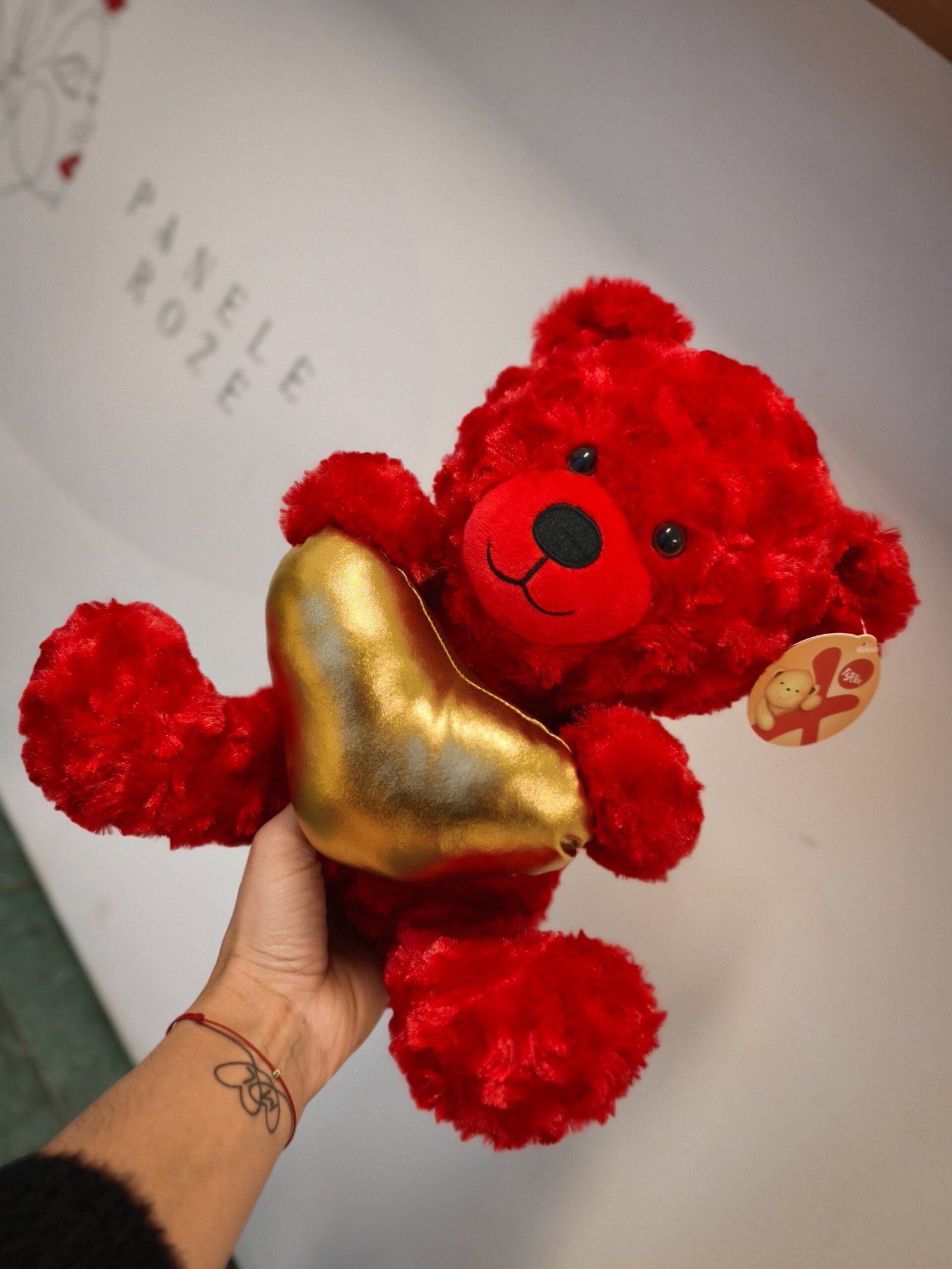 Mielas raudonas meškutis su auksine širdele, tinkantis pridėti prie gėlių ir pabrėžti savo jausmus dar labiau.