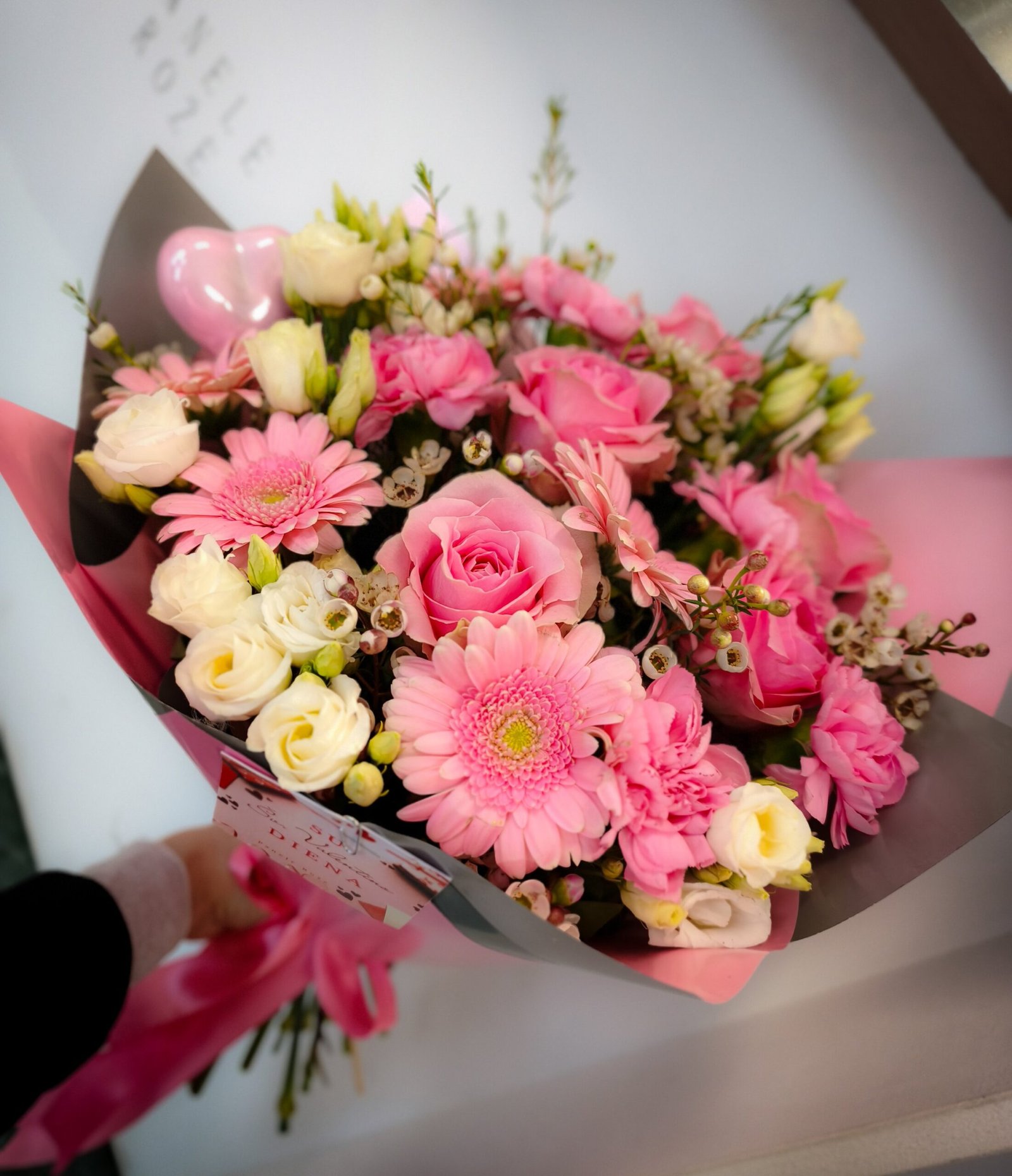 Tai – kruopščiai sukomponuota, ryškiai romantiška puokštė, kurios pagrindinis akcentas yra sodrūs rožiniai tonai. Kompozicijoje dominuoja įvairių atspalvių rožės ir rausvos gerberos, suteikiančios puokštei šviežumo, švelnumo ir vizualinės dinamikos. Puikiai priderintos kreminės eustomos ir smulkūs balti žiedai papildo bendrą struktūrą, suteikdami lengvumo ir natūralaus žydėjimo įspūdį.