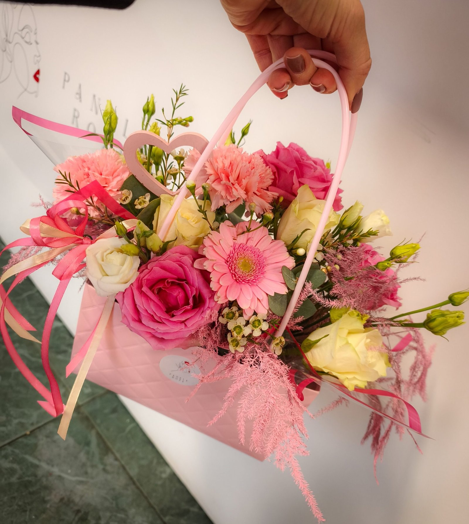 Rožinių gėlių puokštė rankinukas, ne tik mažas išraiškingas akcentas, bet ir praktiška dovana. Ją patogu dovanoti, pernešti ar naudoti kaip interjero dekorą.