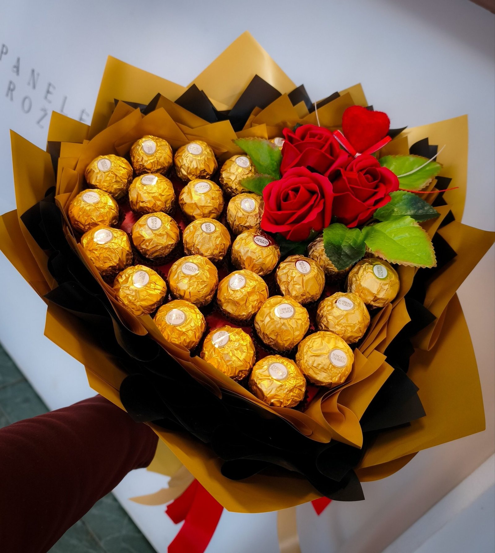 Širdies formos Ferrero Roscher saldainių puokštė su muilo rožėmis